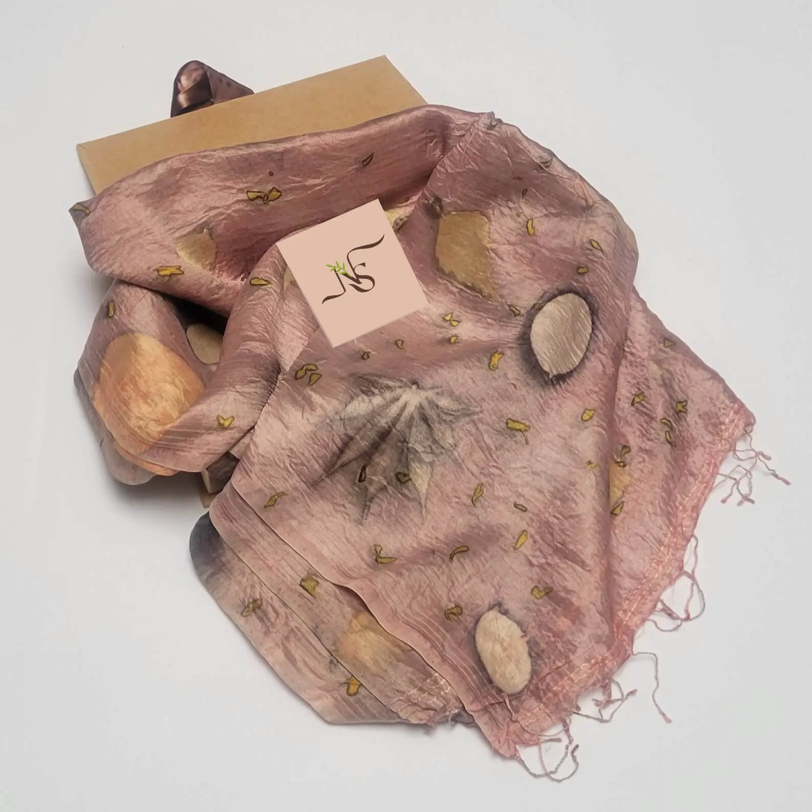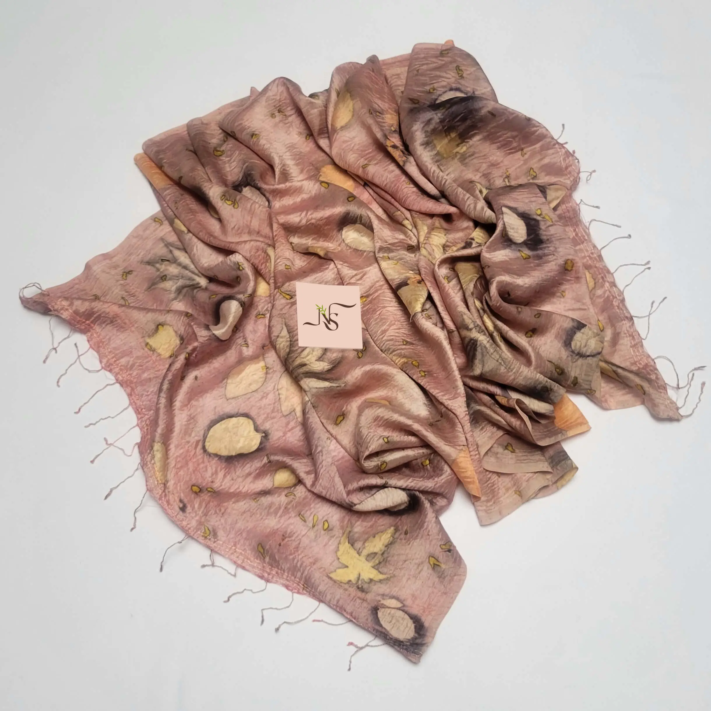 • Handwoven Mulberry Silk dyed with natural dyes and eco-printed with actual leaves.