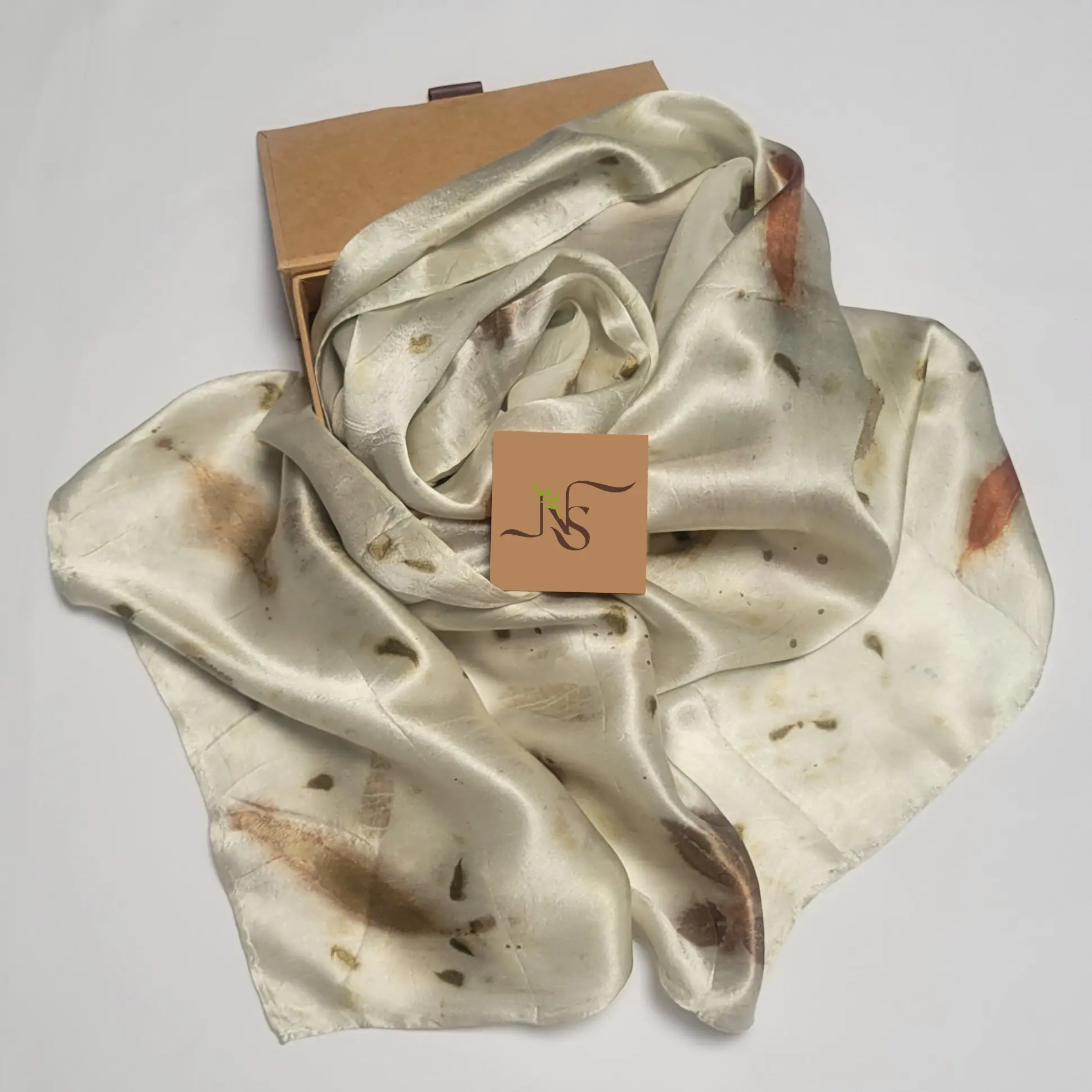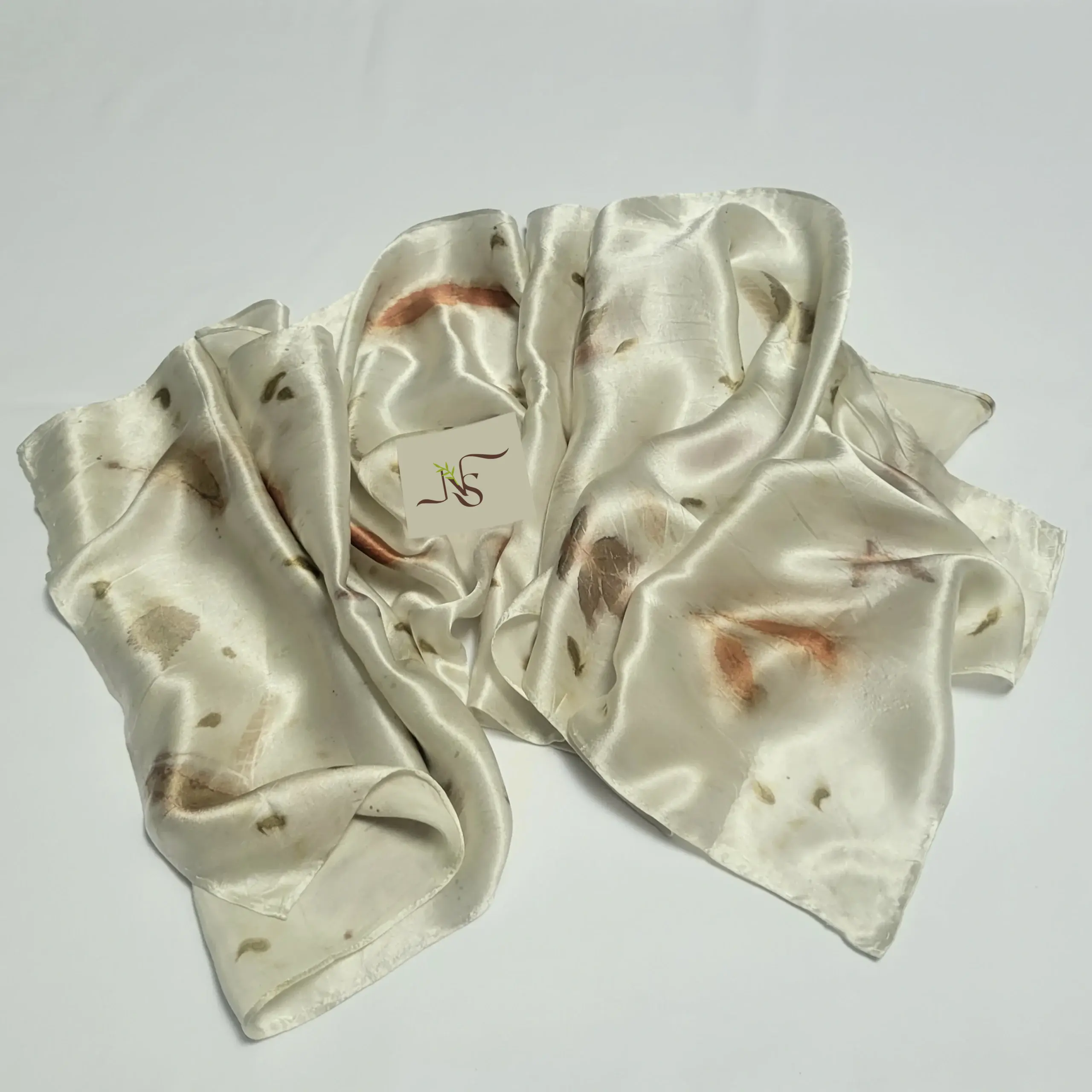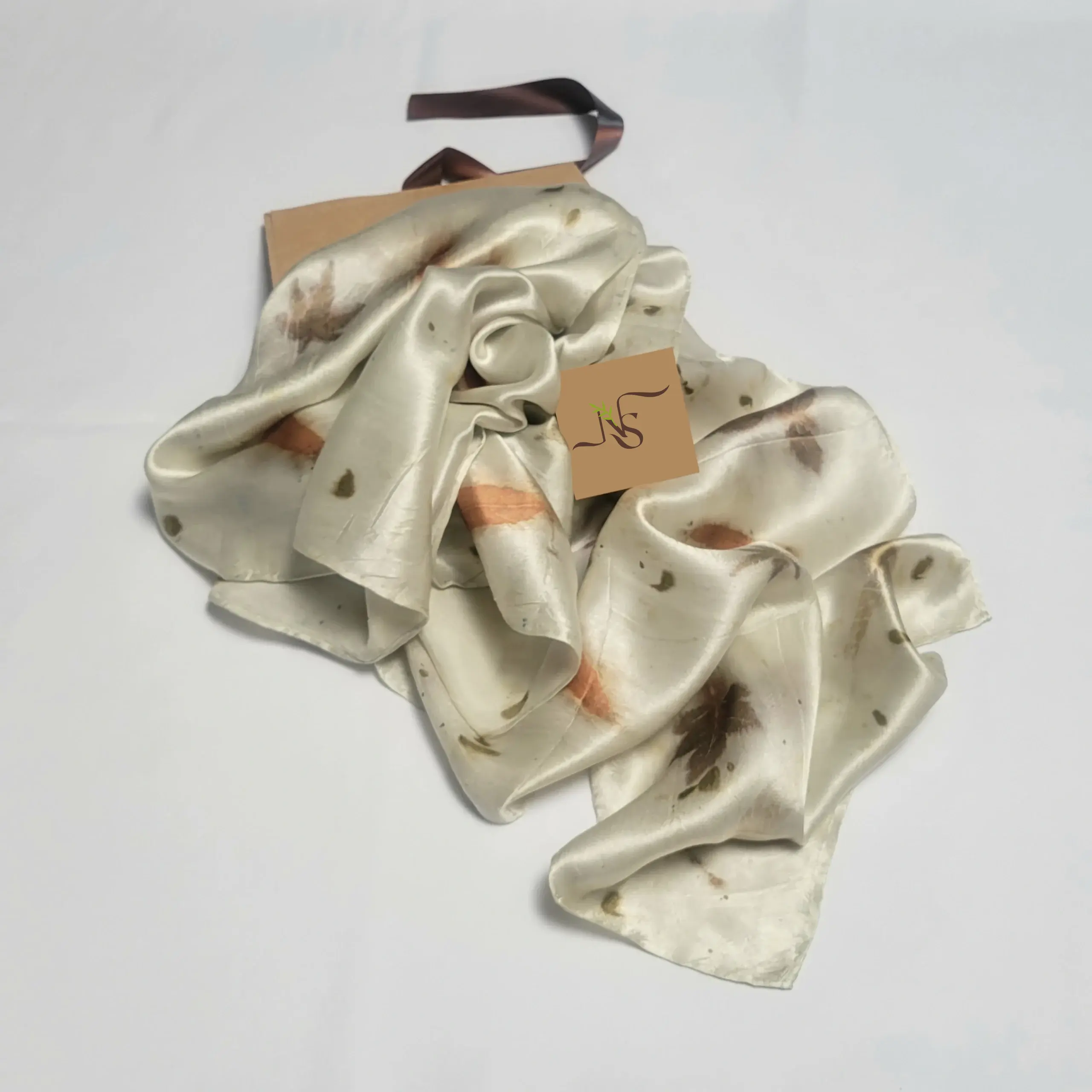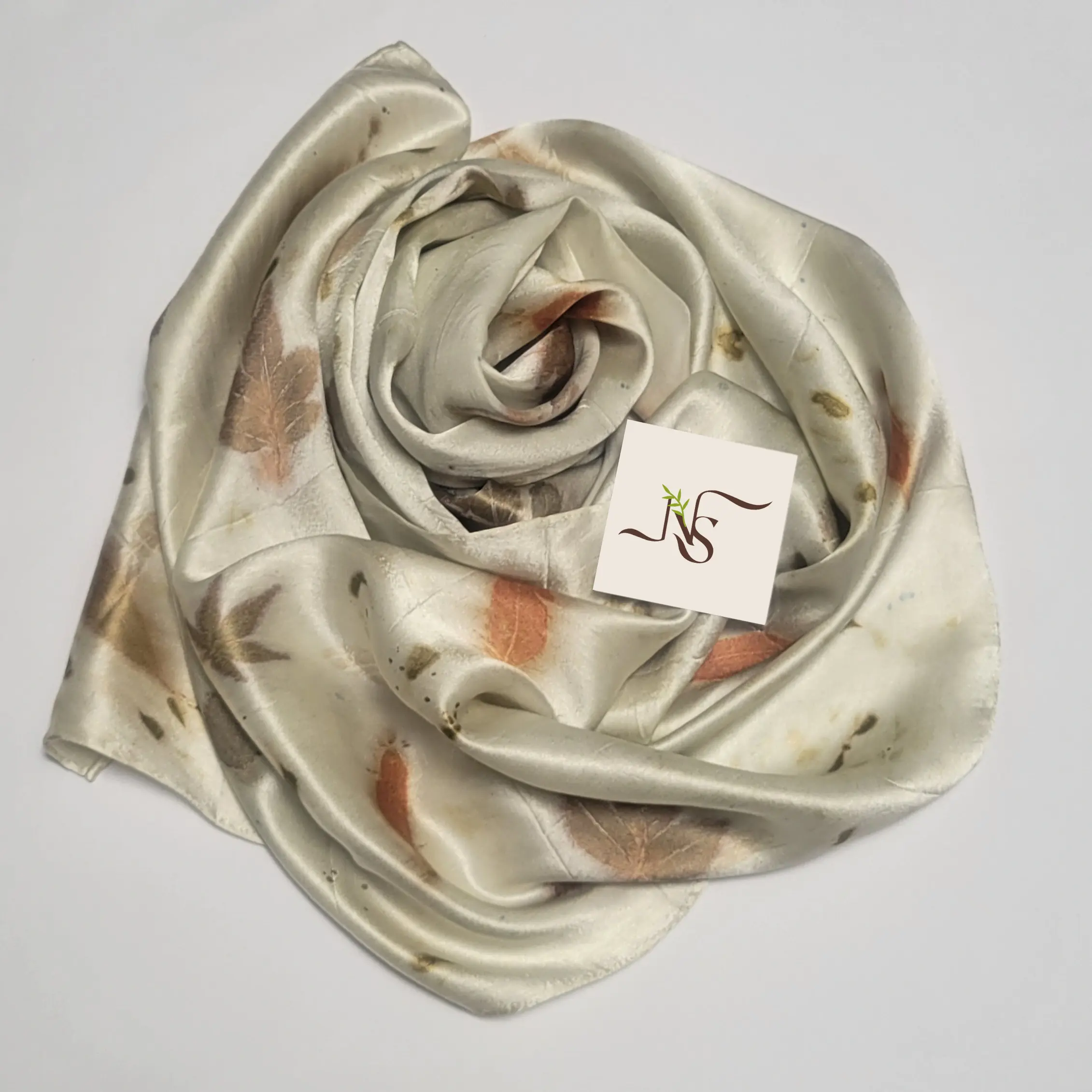 • Satin silk, naturally dyed and eco-printed with actual leaves.
