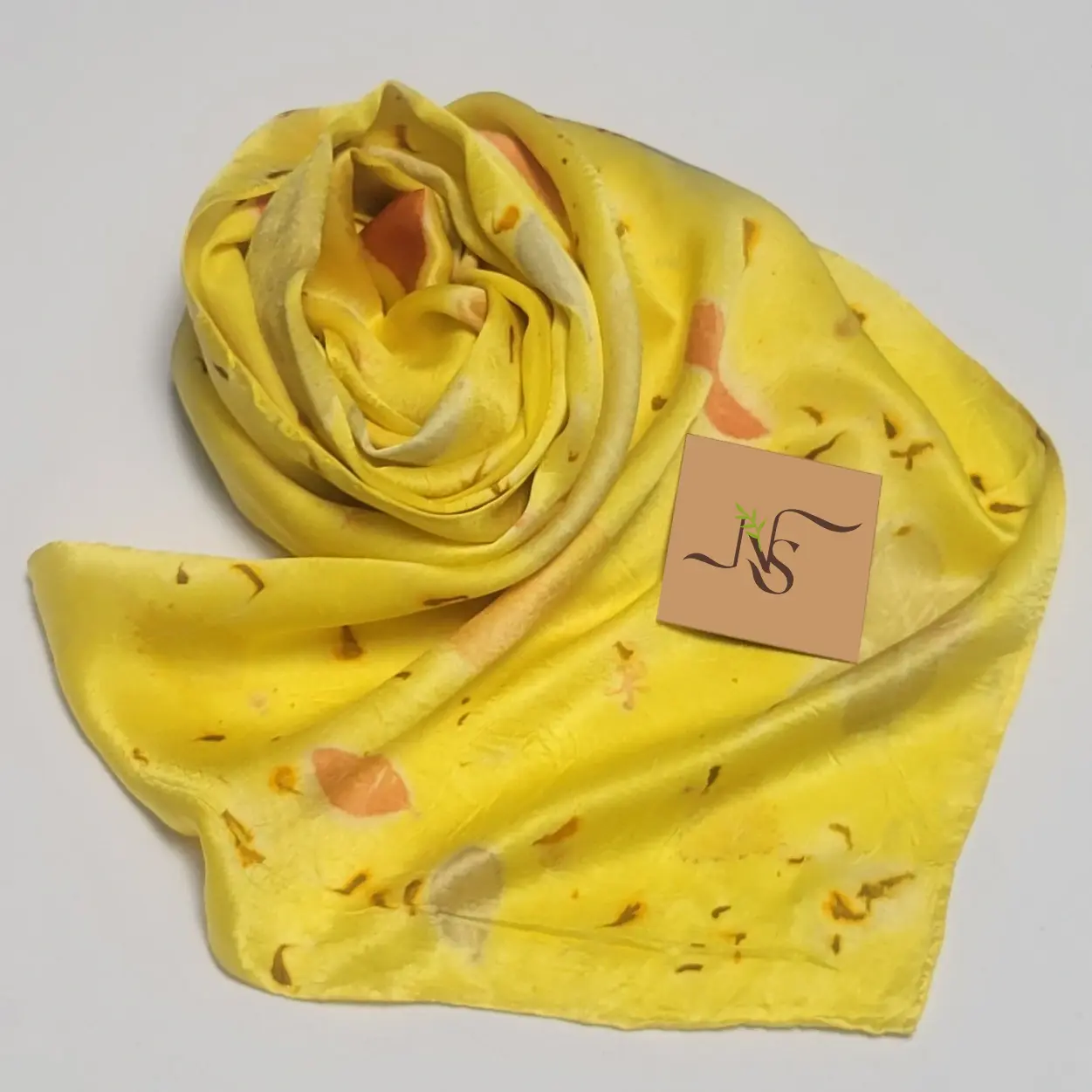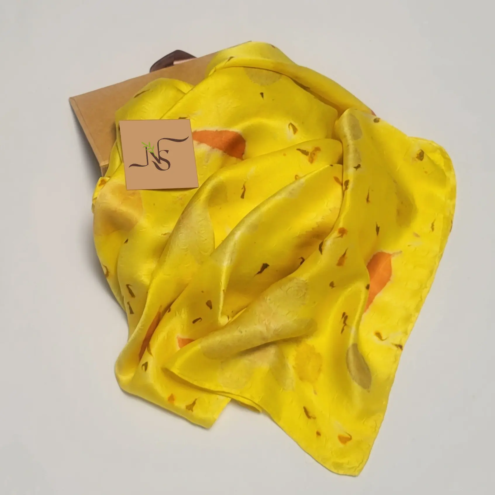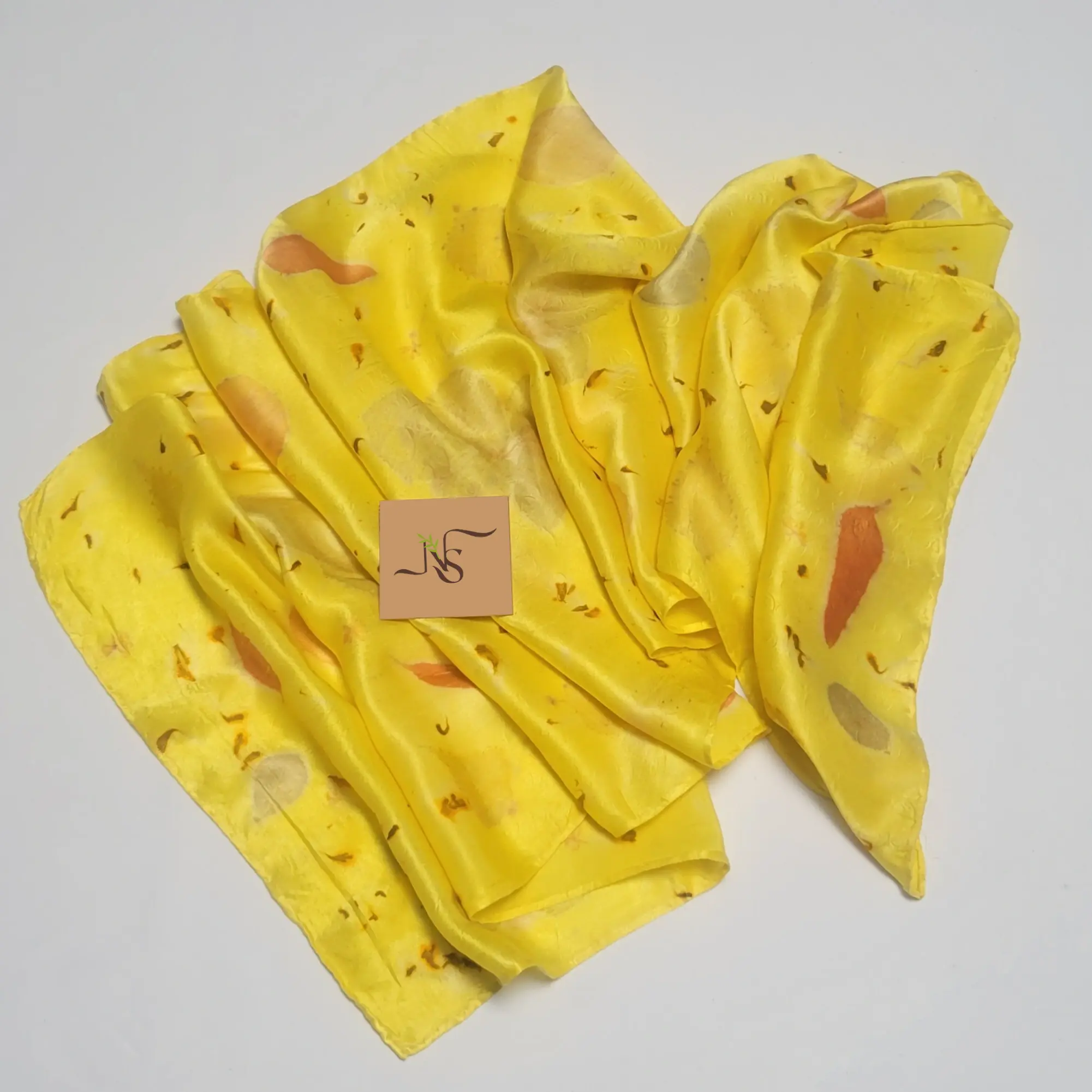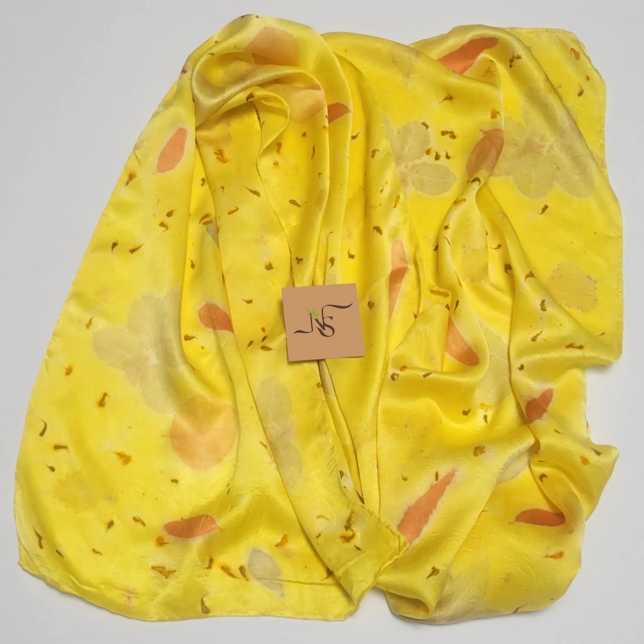 • Satin silk, naturally dyed and eco-printed with many different leaves.