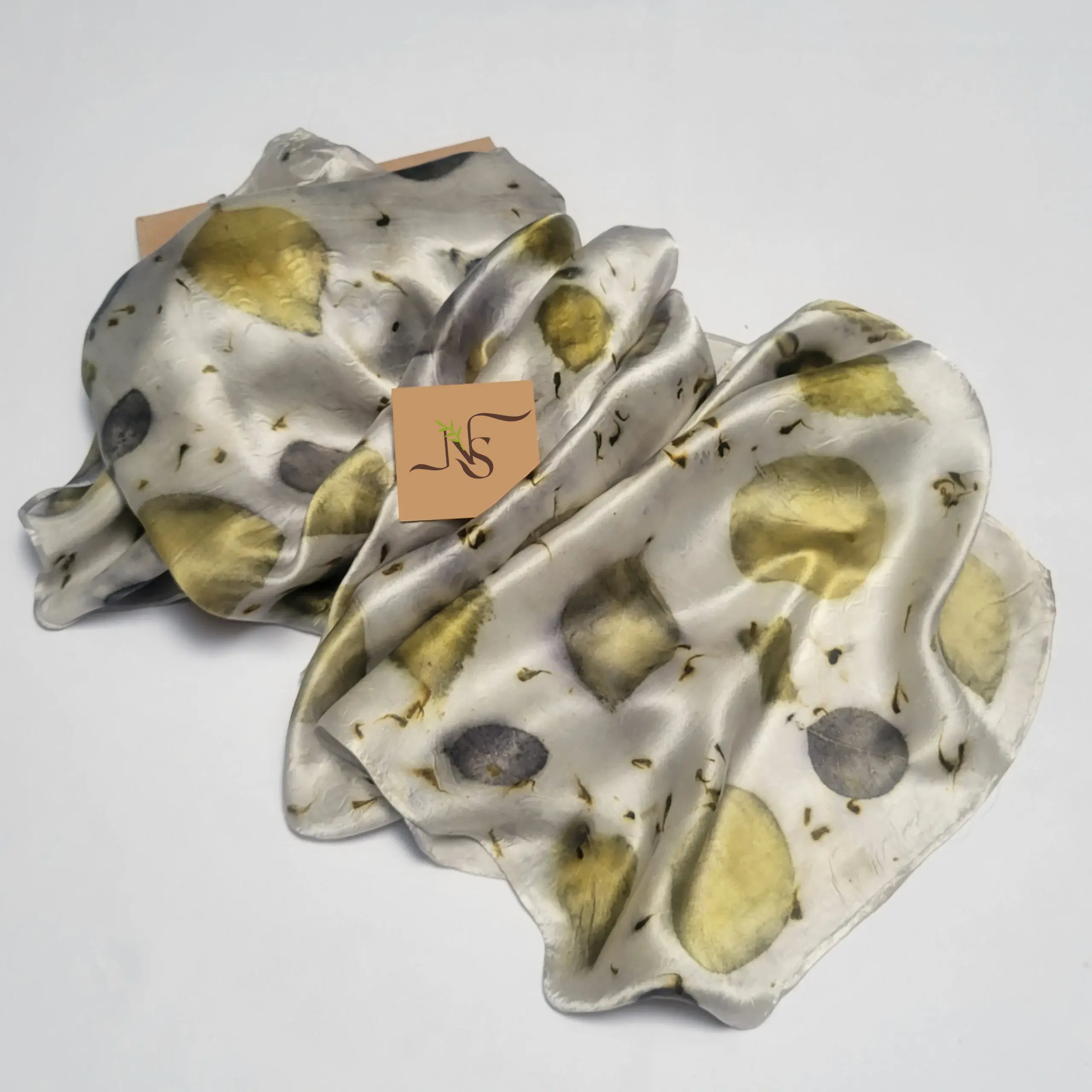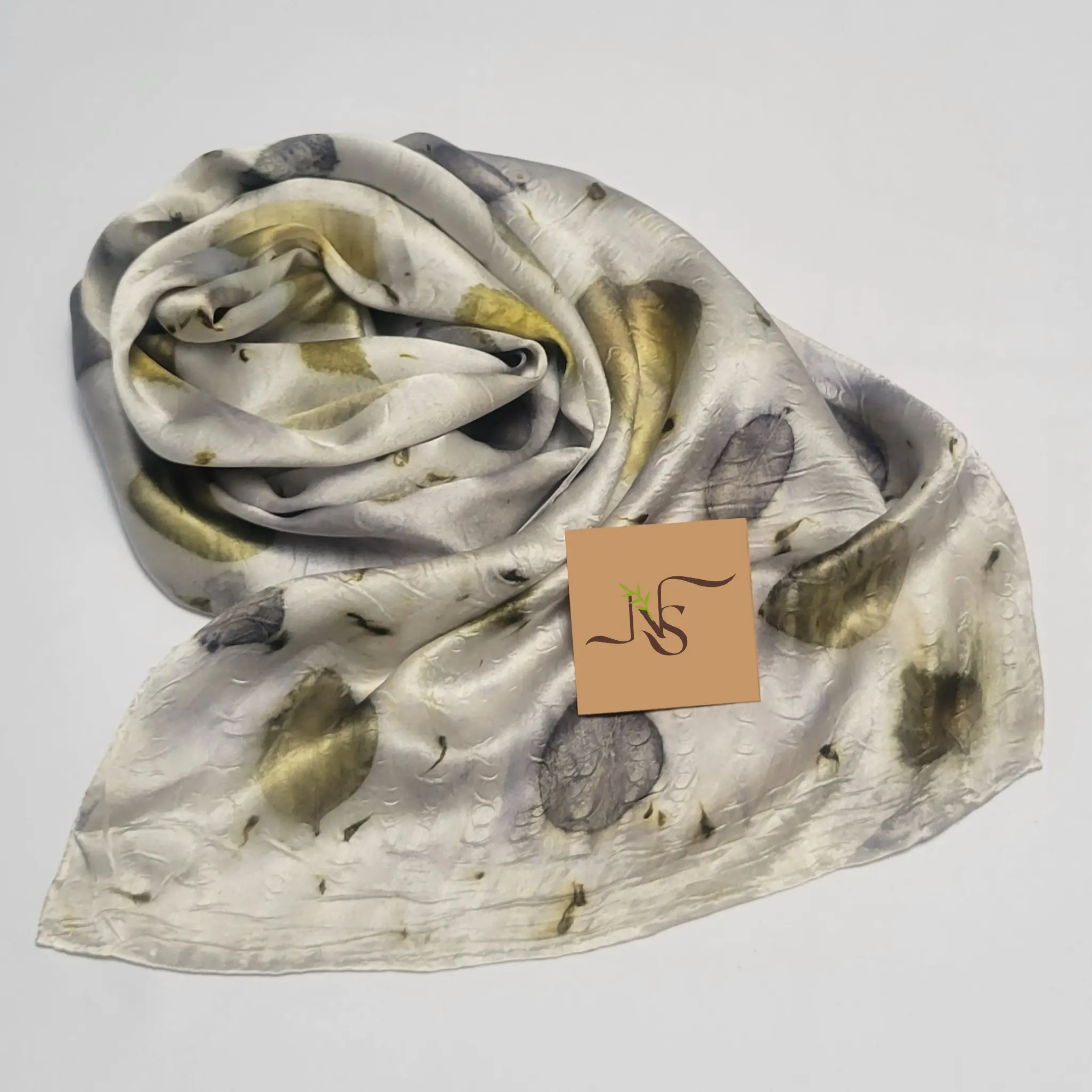 Pearl white stole filled with gray and light golden imprints from leaves of cotinus, eucalyptus, and marigold petals.